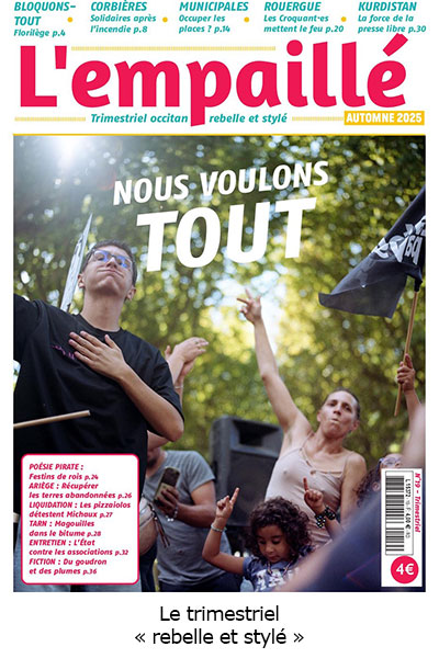 >Yann Buller : le journal a démarré grâce à la volonté de quelques Aveyronnais et Aveyronnaises avec ou sans expérience dans la presse. Ils vont décider de lancer un journal papier sans pub, sans actionnaire. L’idée est de faire entendre des voix différentes sur des sujets de société qui n’étaient pas relayés dans la presse de notre région. En Occitanie comme souvent aussi ailleurs, les groupes de presse locaux ou de la presse quotidienne régionale sont détenus par des monopoles familiaux. Ici, c’est la Dépêche, faut-il la présenter ? Elle fait la place à une information standard, officielle, peu critique… Si à son démarrage la parution du journal est assurée sans périodicité, elle devient très vite trimestrielle et à partir de 2019 la version départementale passe à une version régionale, sur la région Occitanie. Depuis le numéro 12, treize nouveaux départements se sont ainsi rajoutés à l’ancienne région de l’Aquitaine, le Limousin, l’Ardèche et la Drôme. L’Empaillé couvre aujourd’hui le quart Sud-Ouest de la France.